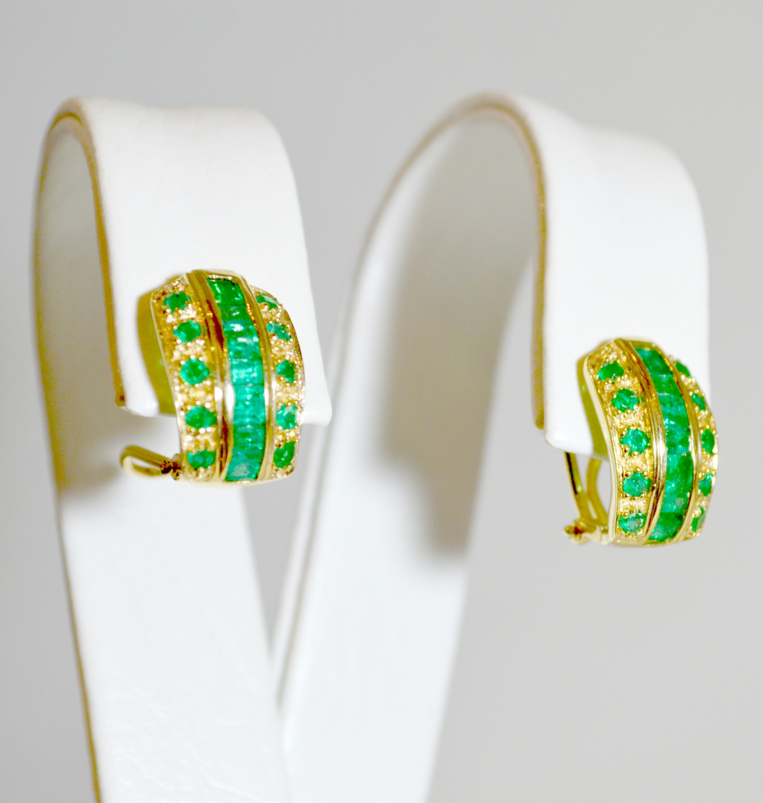 Aretes Elaborados en Oro 18k Omega con Esmeraldas al Carre y Esmeraldas Redondas Pequeñas. Oro 8.6gr Esm 2,8ct